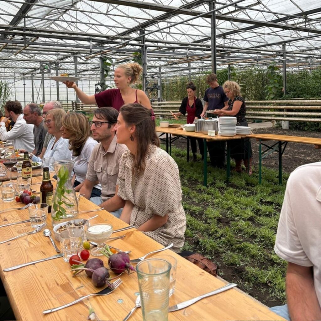 Schuif mee aan, aan de lange tafel langs de akker of in de kas.